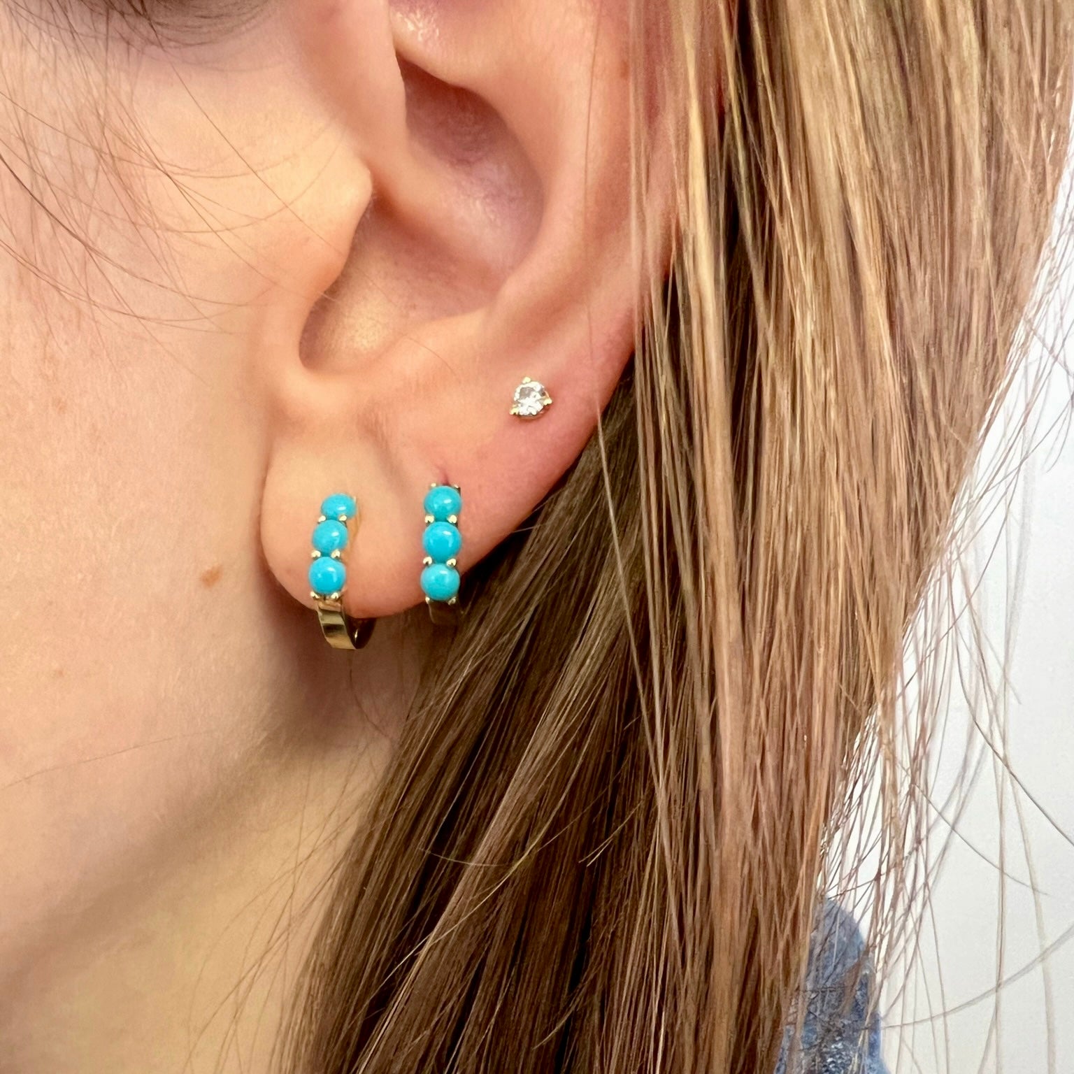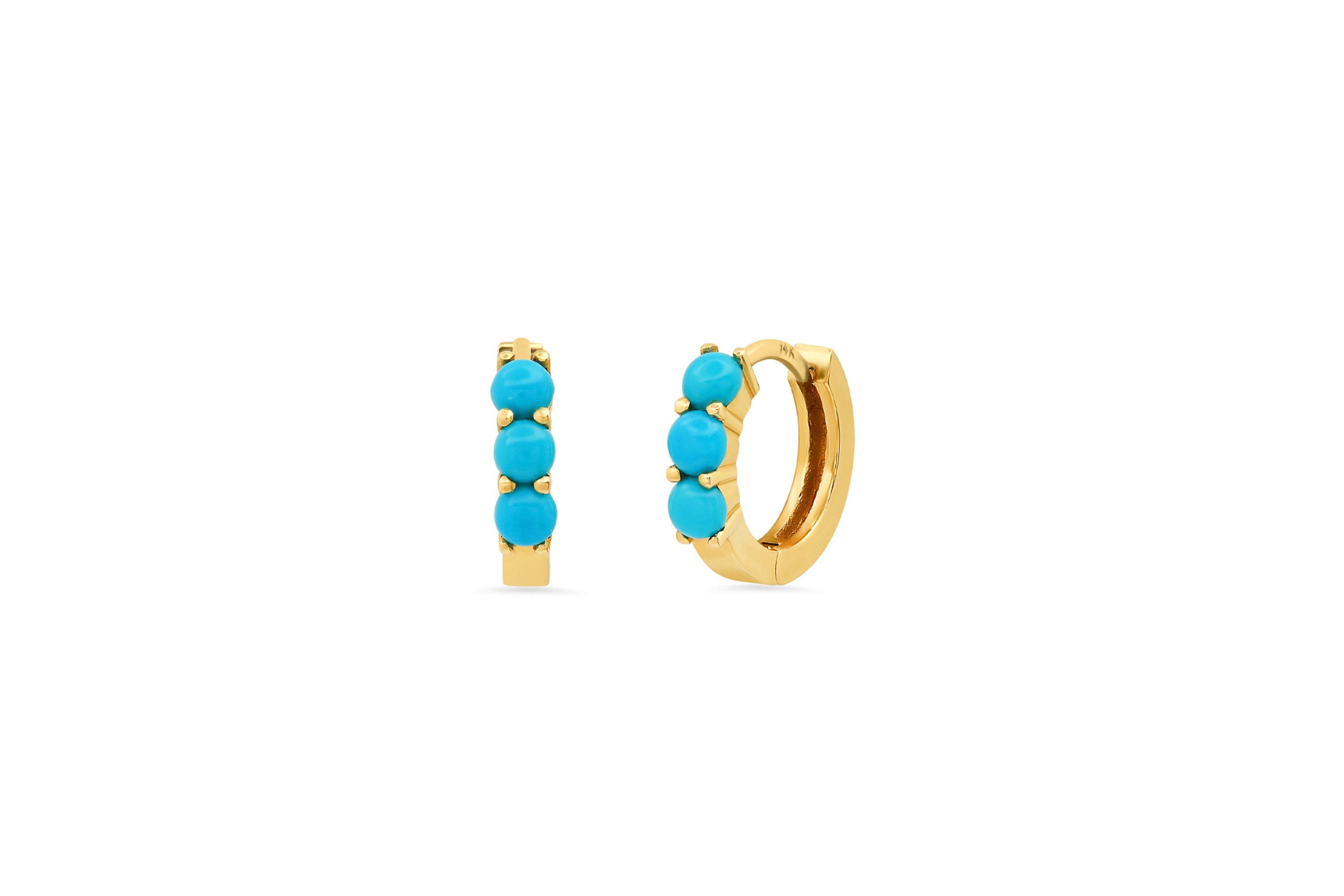 These 3 turquoise huggie earrings are stunning! The 14k gold setting adds a subtle contrast while the bright stones bring fun and color. Perfect for special occasions or everyday wear.