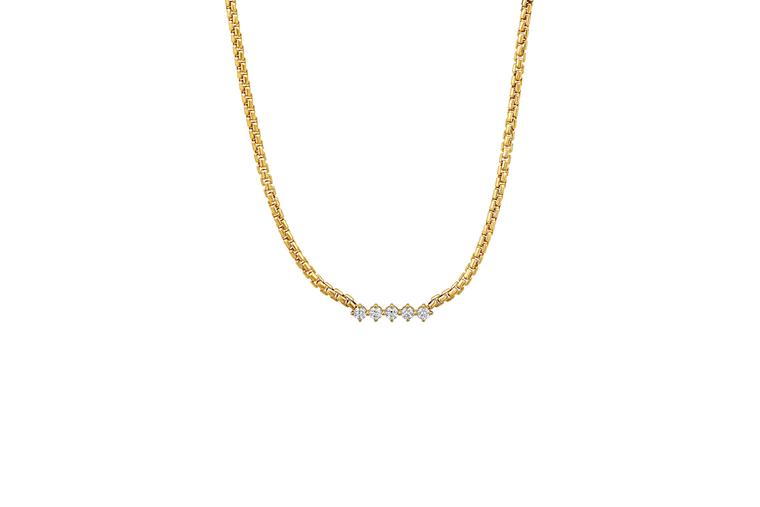 This .50 cttw 5 diamond boxchain necklace is the perfect layering piece. The elegant box chain adds a sophisticated touch to any outfit, while the 5 diamonds provide a luxurious sparkle.