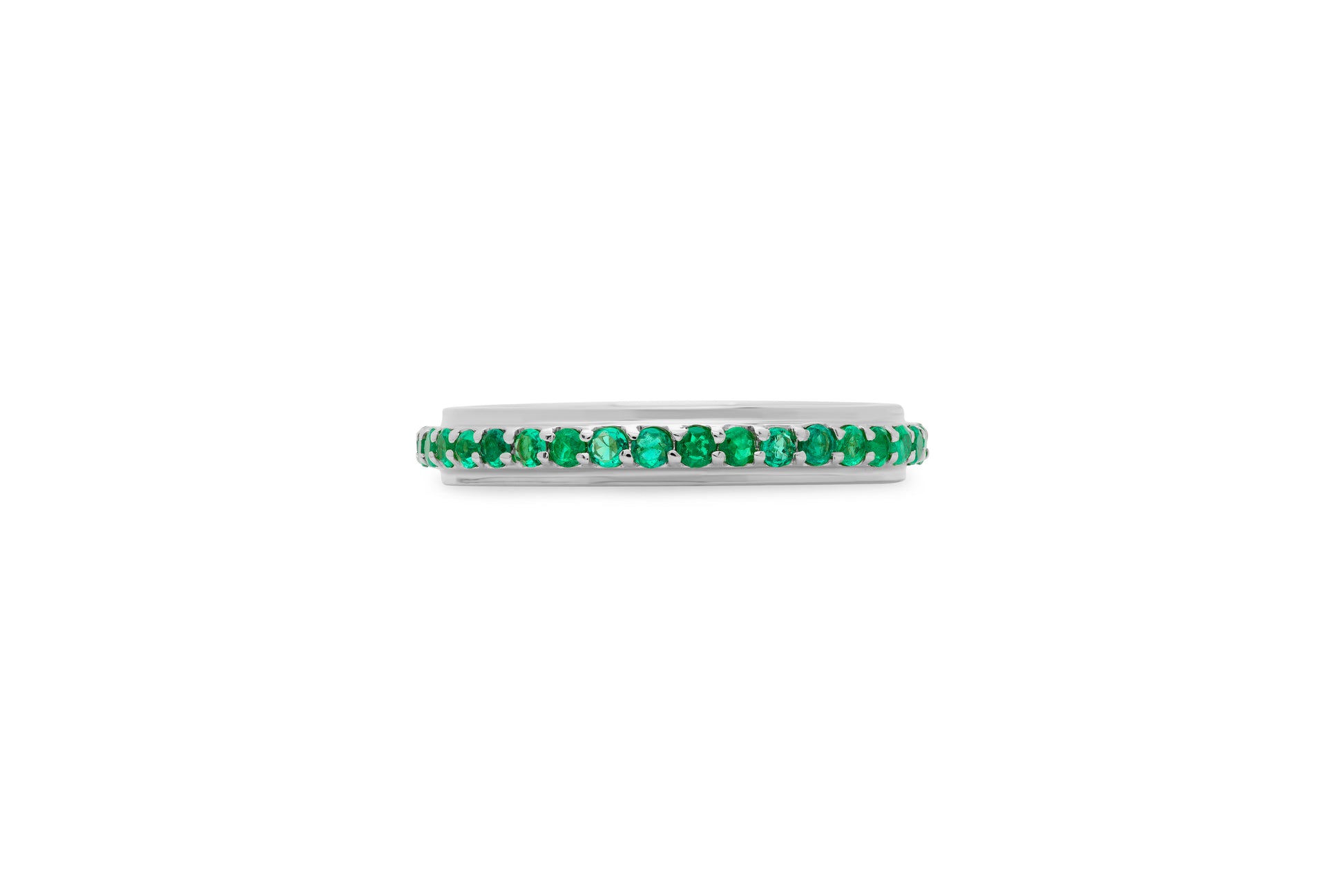 This Emerald Eternity Ring is crafted from 14k gold and features a stunning emerald hue, creating a classic look with a modern touch. The combination makes the ring a timeless piece that will stand out in any occasion.