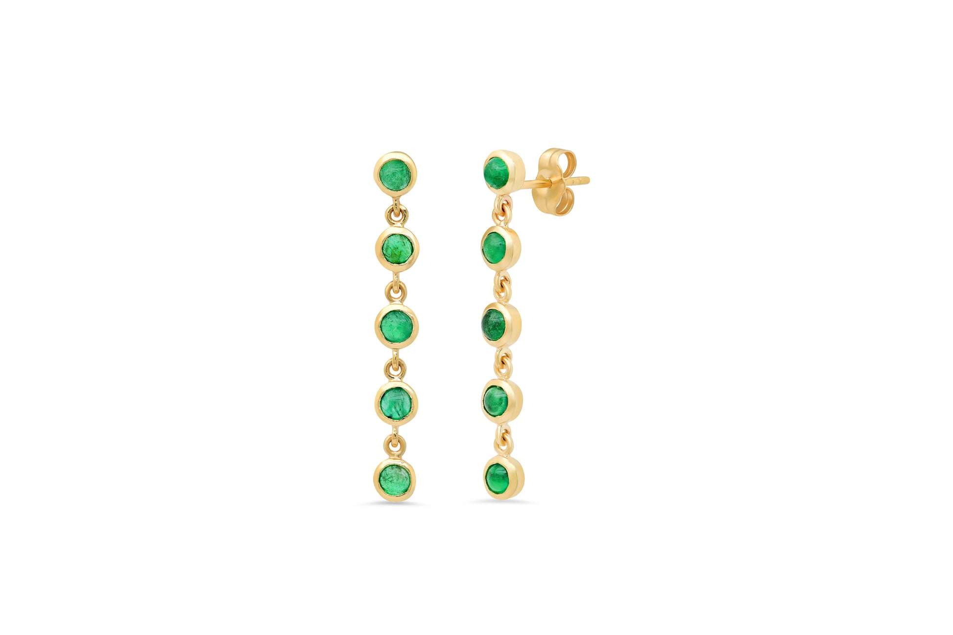 These 5 Emerald Bezel Drop Earrings are adorned with bright, vivid green emeralds, set in luxurious 14k gold. Combining the beauty of emeralds with a classic gold design, the statement earrings are sure to make you stand out.
