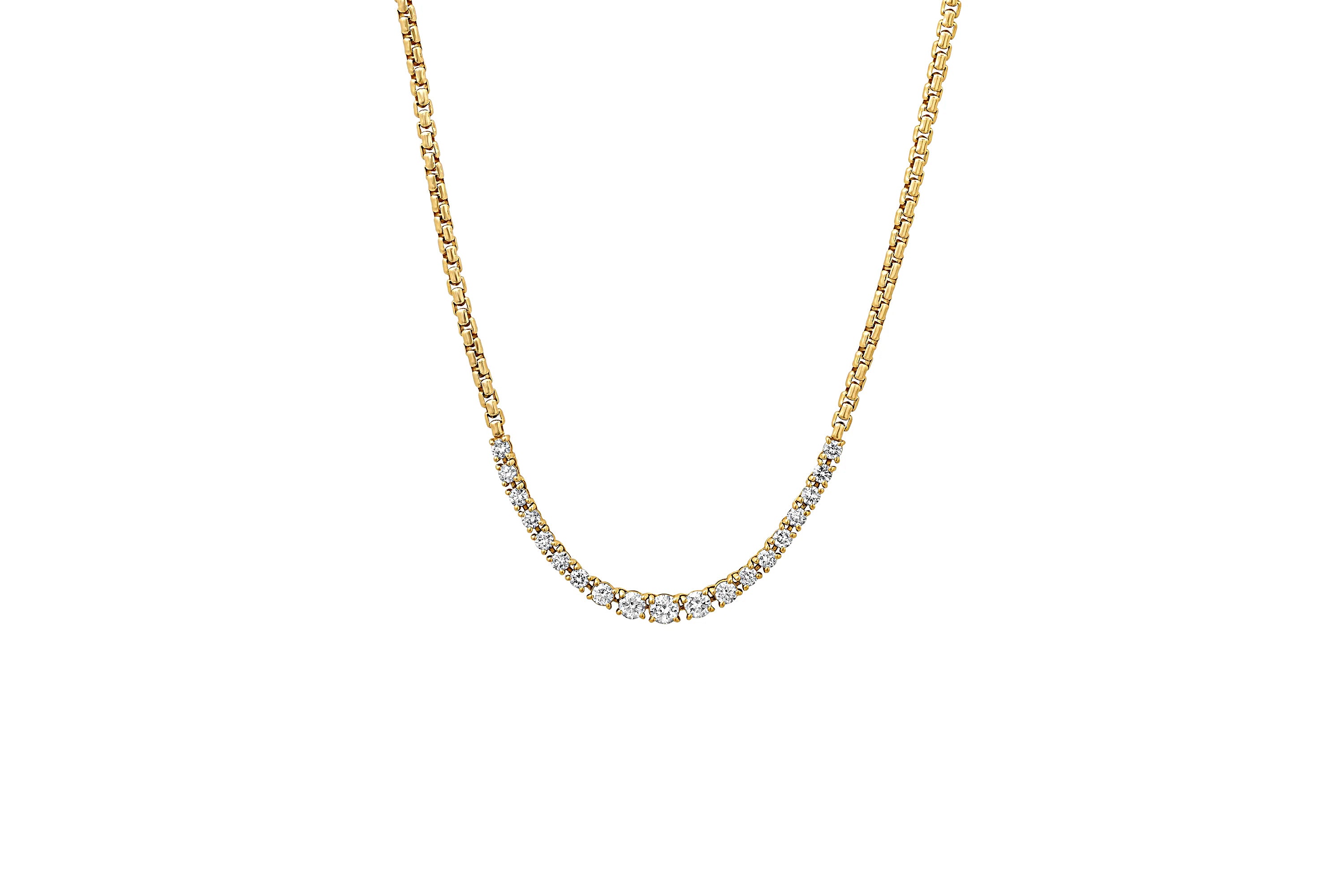 This chic graduated diamond necklace features stunning diamonds, elegantly set in a 14k gold boxchain. Perfect for any occasion, the necklace is sure to add a touch of sophistication to any outfit.