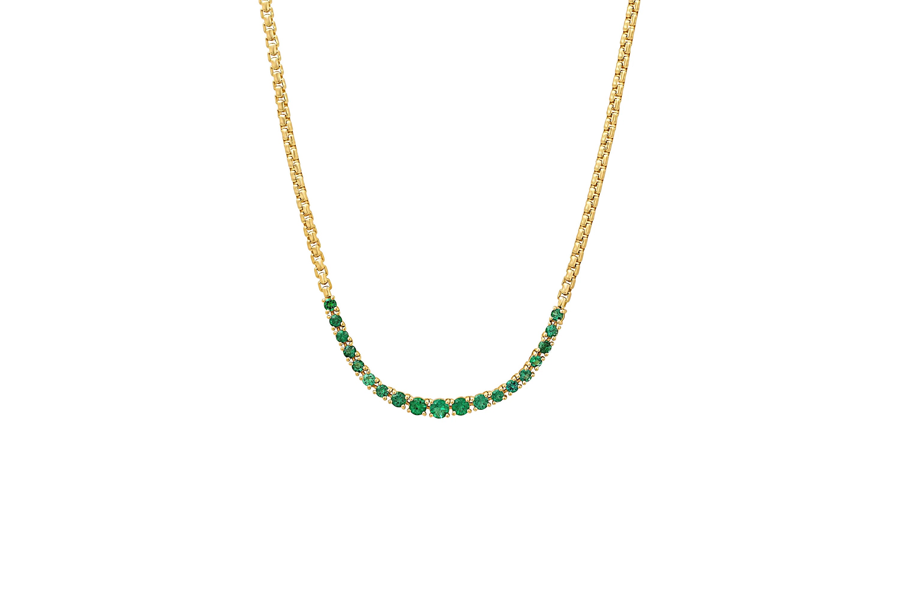 This breathtaking necklace features graduated emerald stones set in 14k gold boxchain. Perfect for adding a chic and elegant statement to any look.