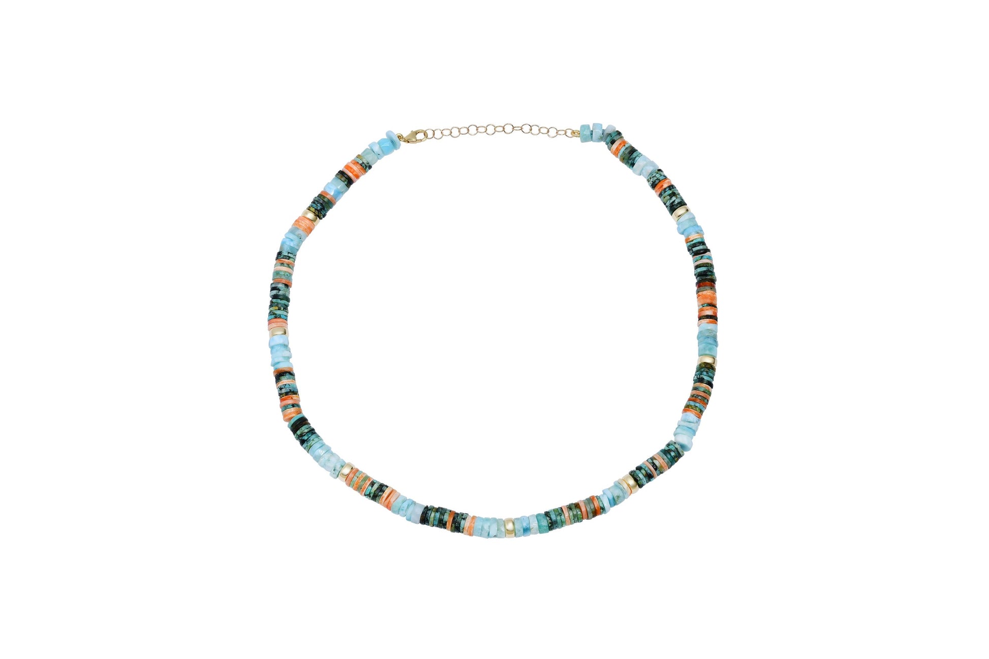 Luminous larimar and vibrant spiny oyster turquoise meet delicate 14k gold in this coastal-inspired layered necklace. Perfect for stacking or wearing solo, it transitions seamlessly from beach days to everyday wear with understated luxury and timeless appeal.