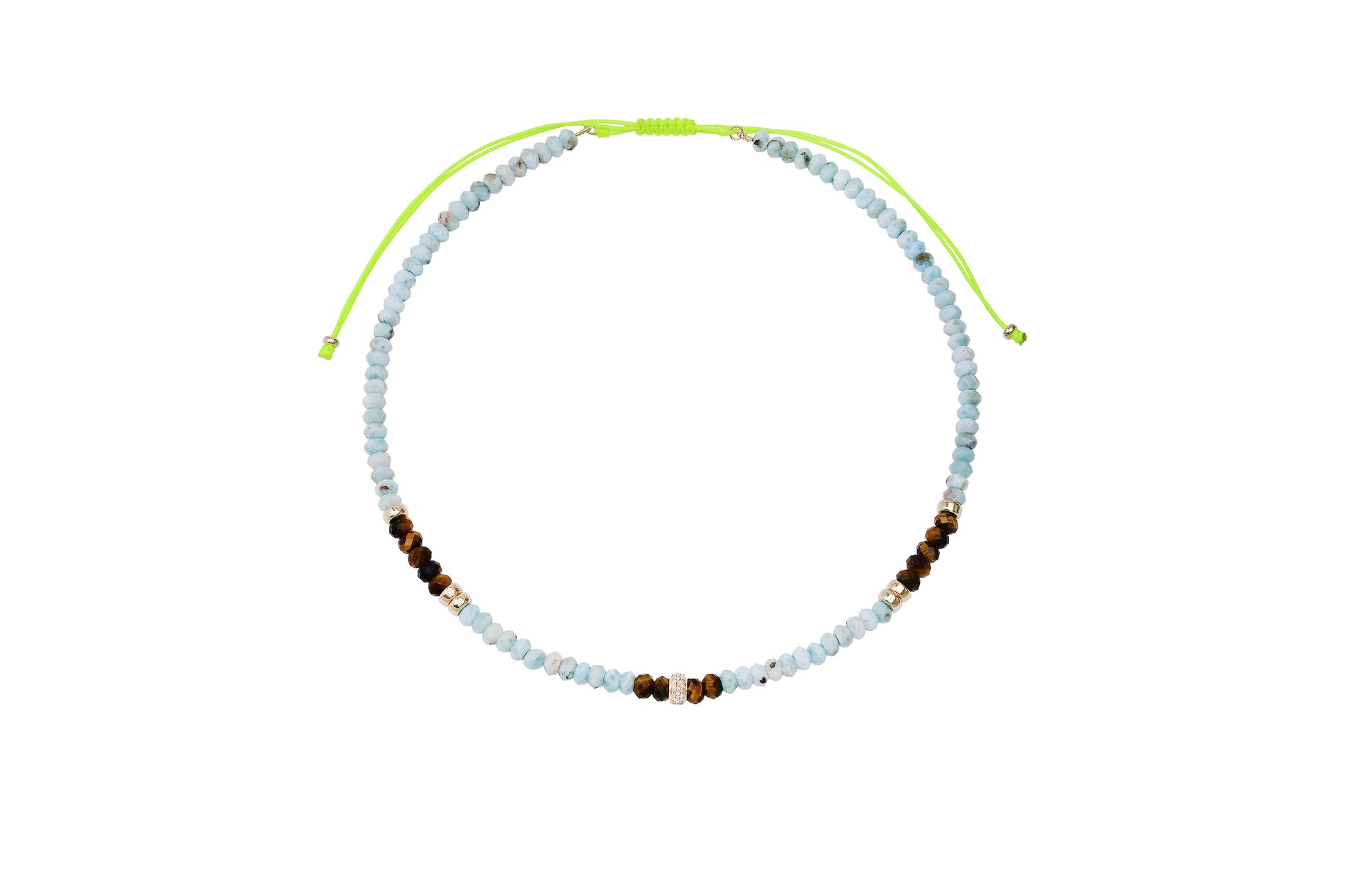 Elevate your style with this chic necklace featuring calming Larimar, protective Tigers Eye, and elegant 14k gold and diamond beads. Perfect for adding a touch of sophistication to any outfit.