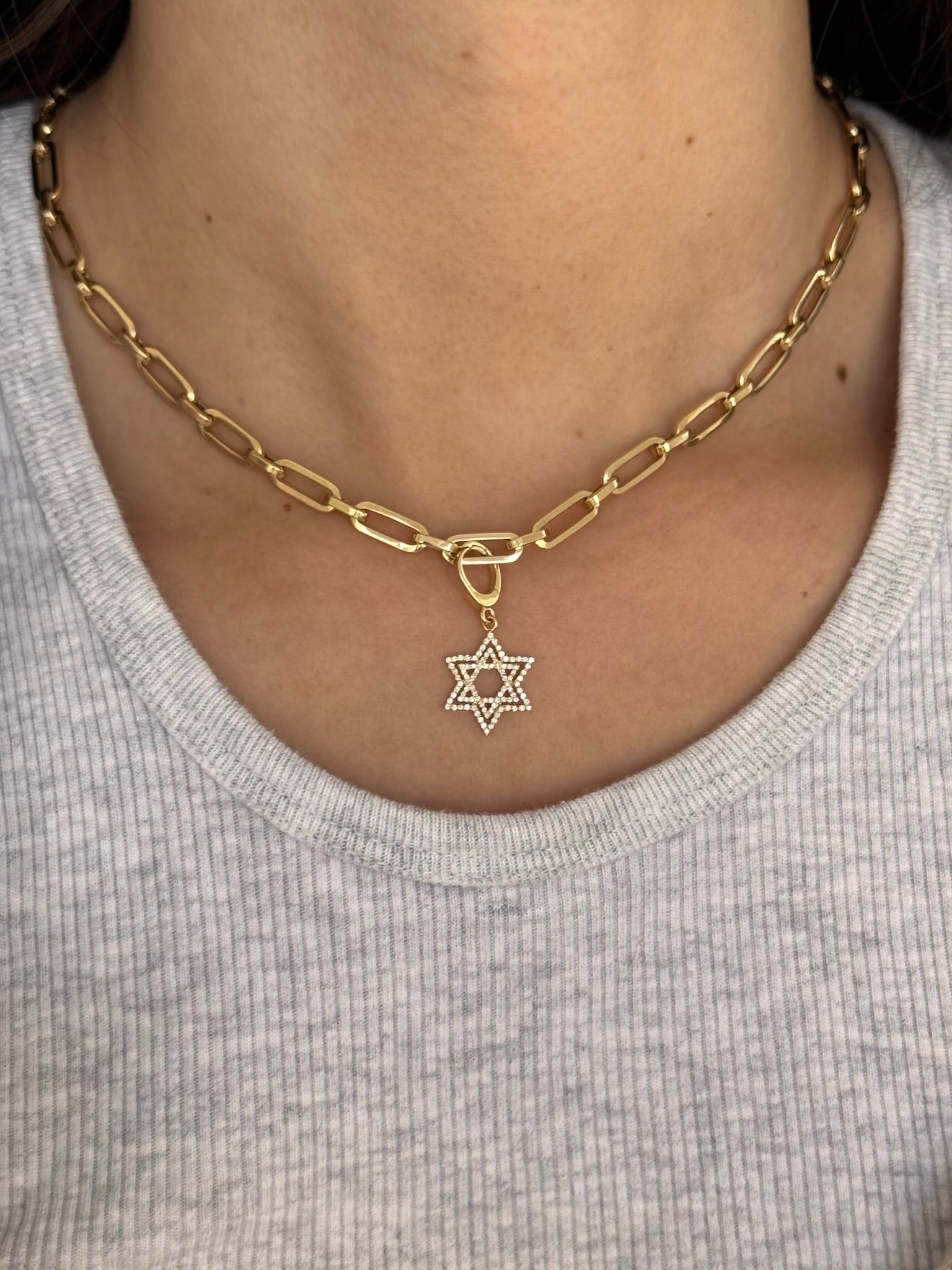The Mini Diamond Outline Star of David combines beauty and meaningful symbolism with a chic, sophisticated design. Its delicate diamond outline offers a refined elegance, creating a timeless piece that effortlessly enhances any look while honoring a rich heritage.