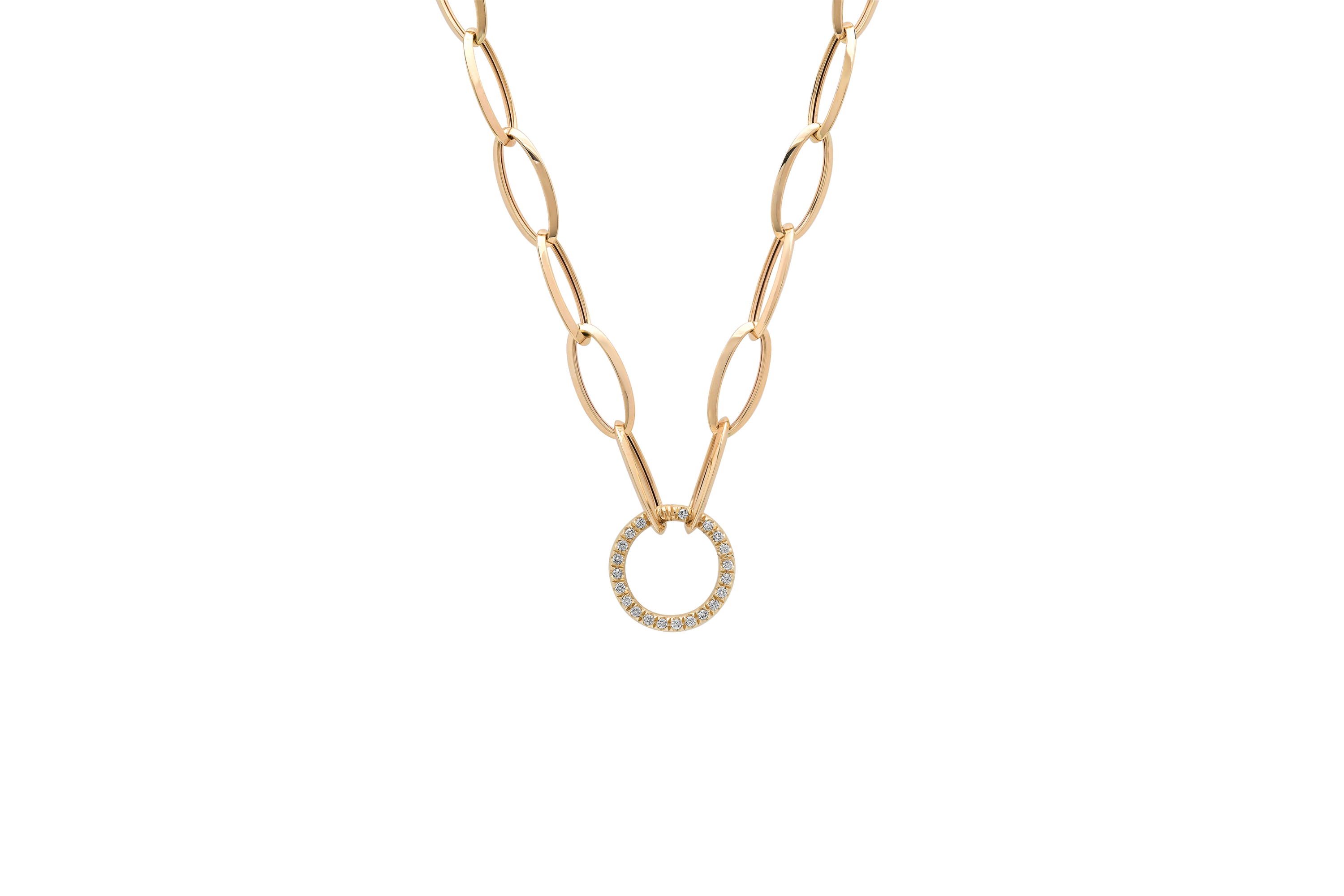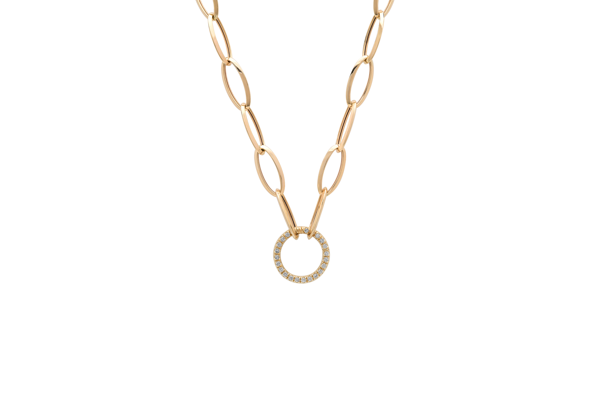 This mini jumbo link ring pairs timeless gold with a brilliant diamond charm ring for understated elegance. Its versatile design works with any charm—dress it up or keep it casual. A gorgeous piece that deserves a permanent spot in your necklace rotation.