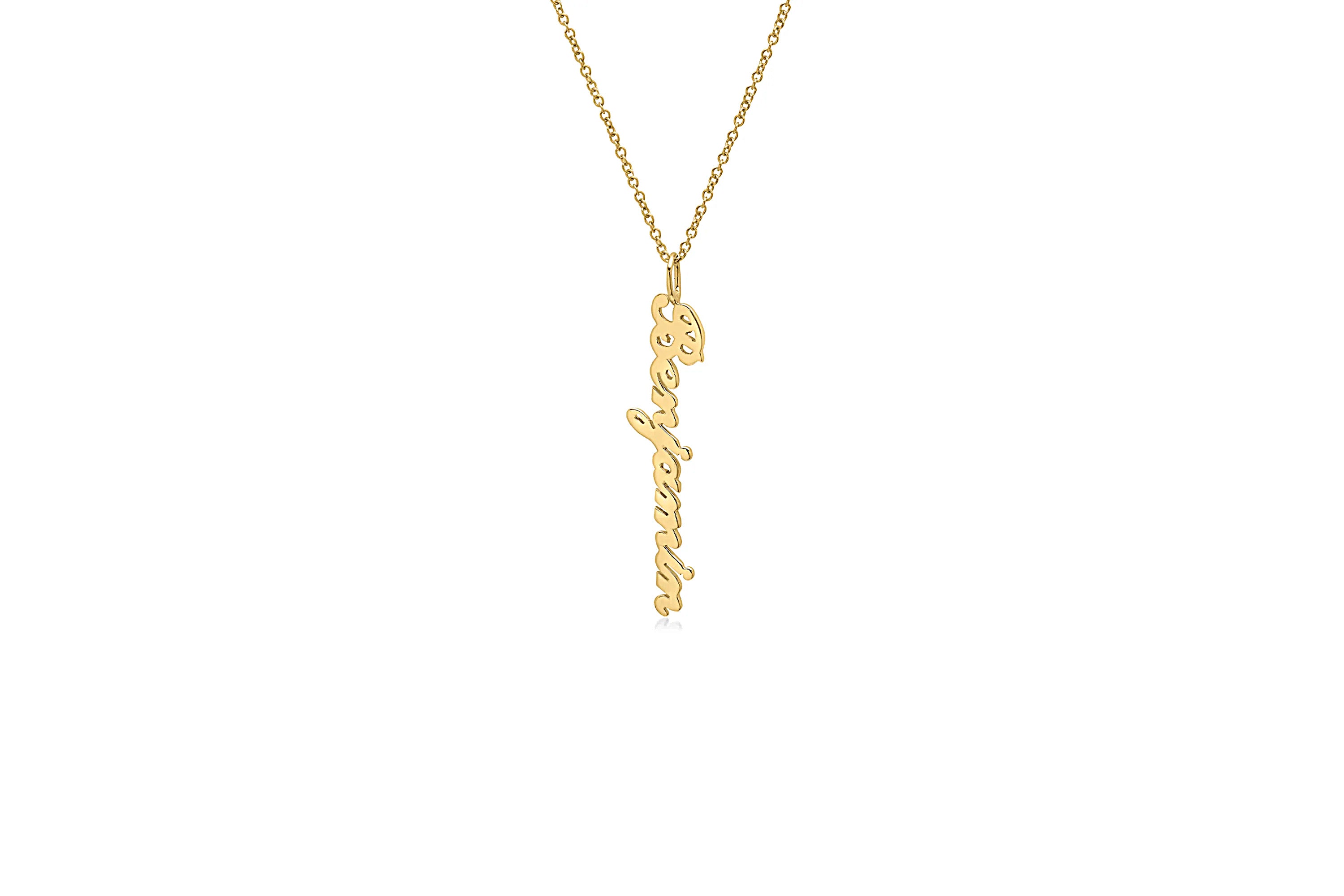 Personalized to your style! A vertical or horizontal 14K solid gold name plate adds edge to an everyday necklace.