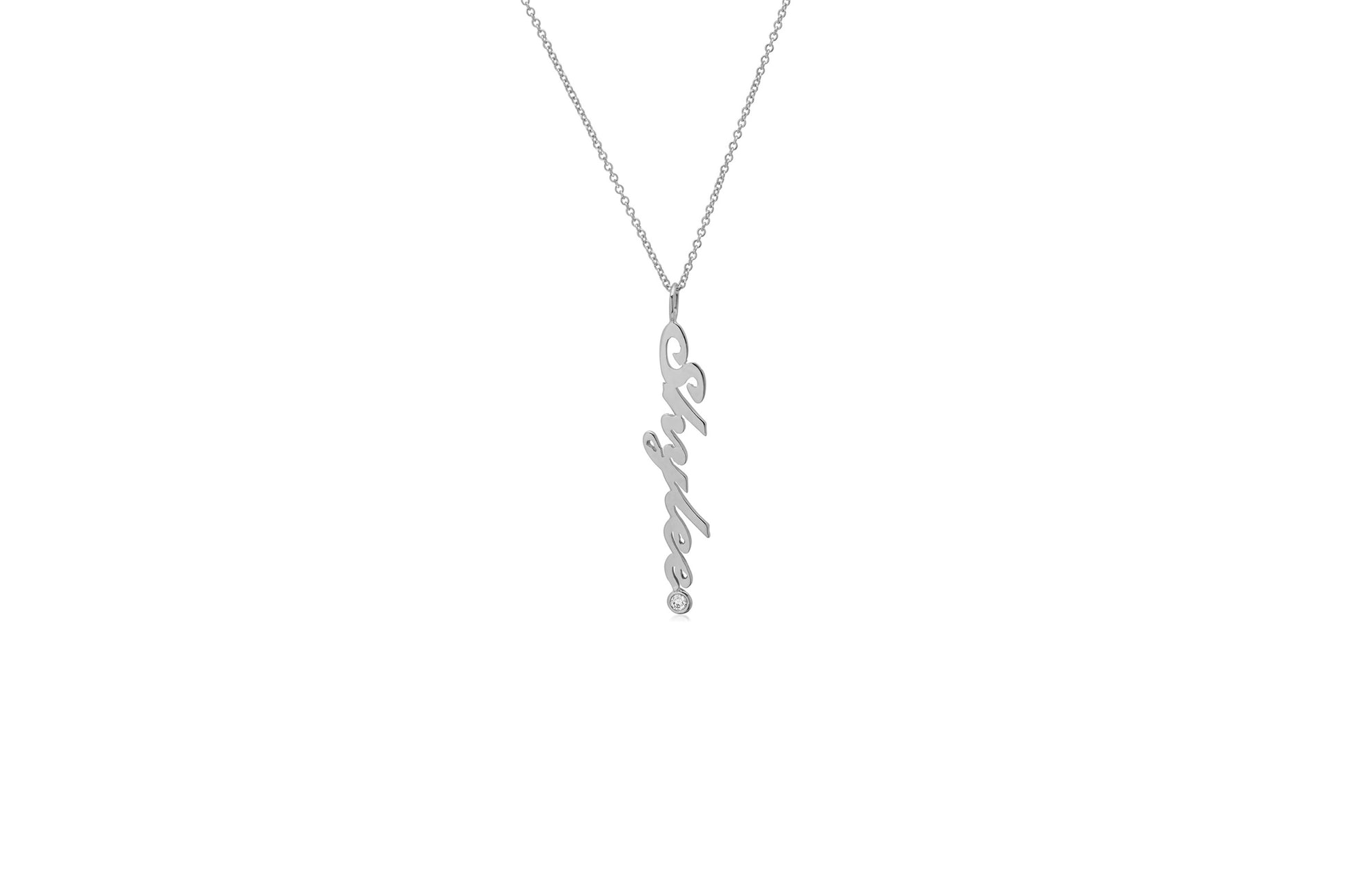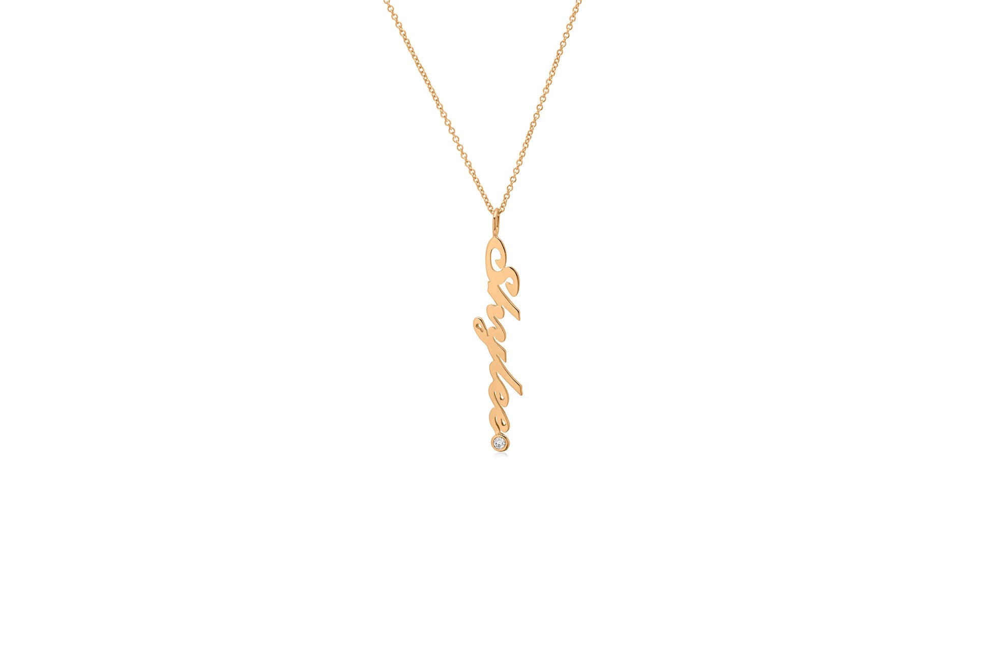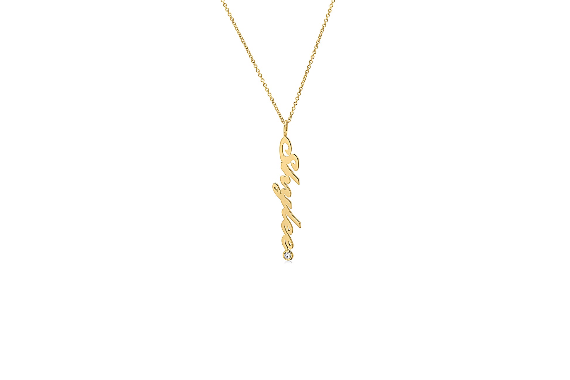 Personalized to your style! A vertical or horizontal 14K solid gold name plate adds edge to an everyday necklace.