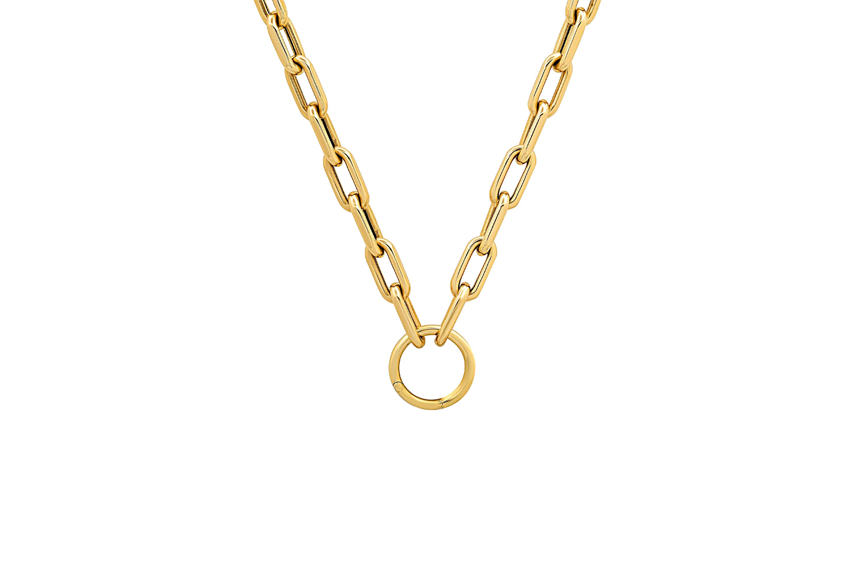 The Open Link Necklace with Solid Gold Charm Holder blends the best of both worlds! The strong, hollow lightweight links are connected by a Solid Gold Charm Holder to allow for the maximum number of charms to make a statement!