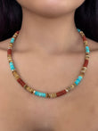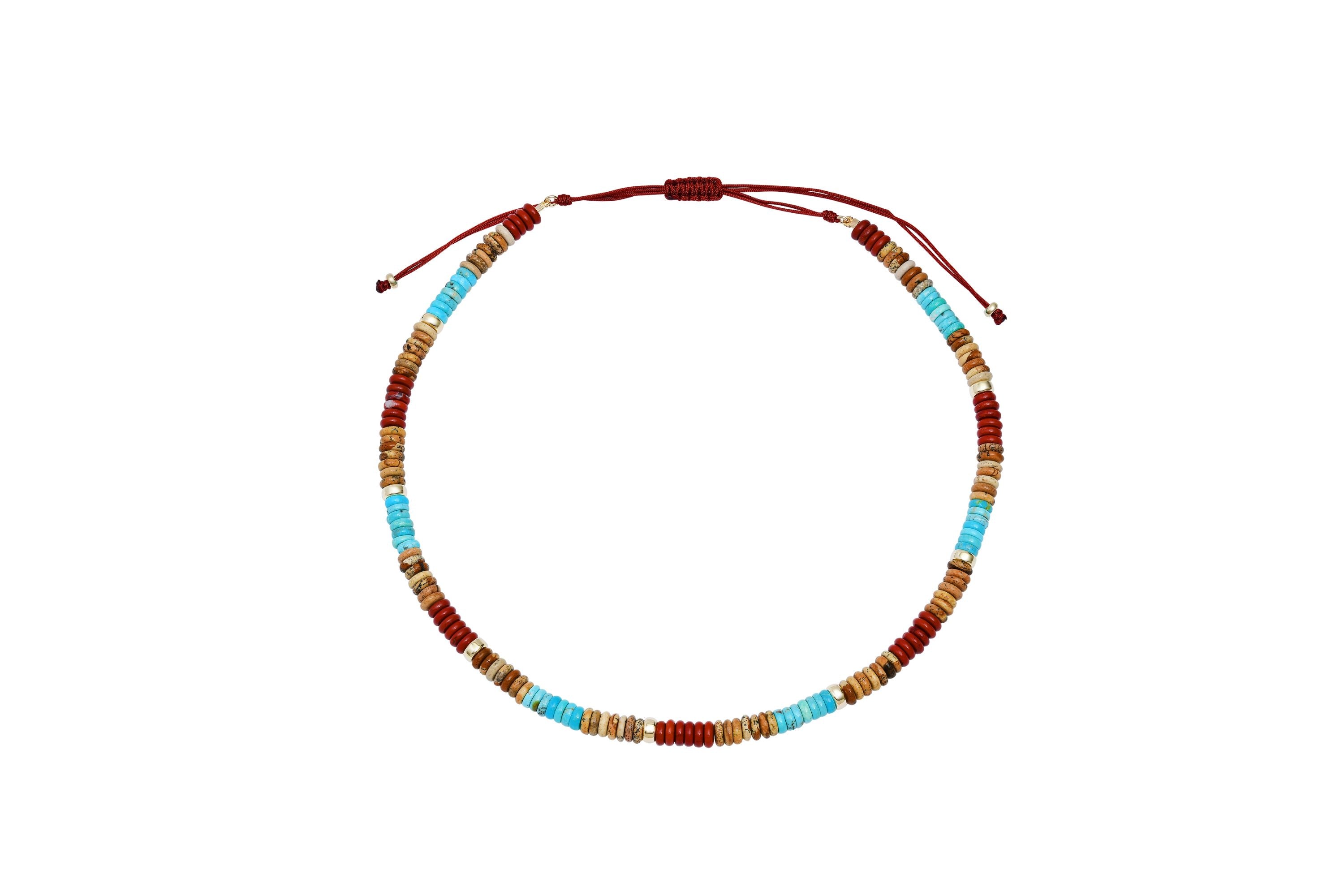 Earthy Picture Jasper and Rainbow Jasper meet vibrant turquoise in this layered beaded necklace. Delicate 14k gold accents add sophistication to a piece that's perfect worn solo or stacked with others. Nature-inspired elegance with coastal charm.
