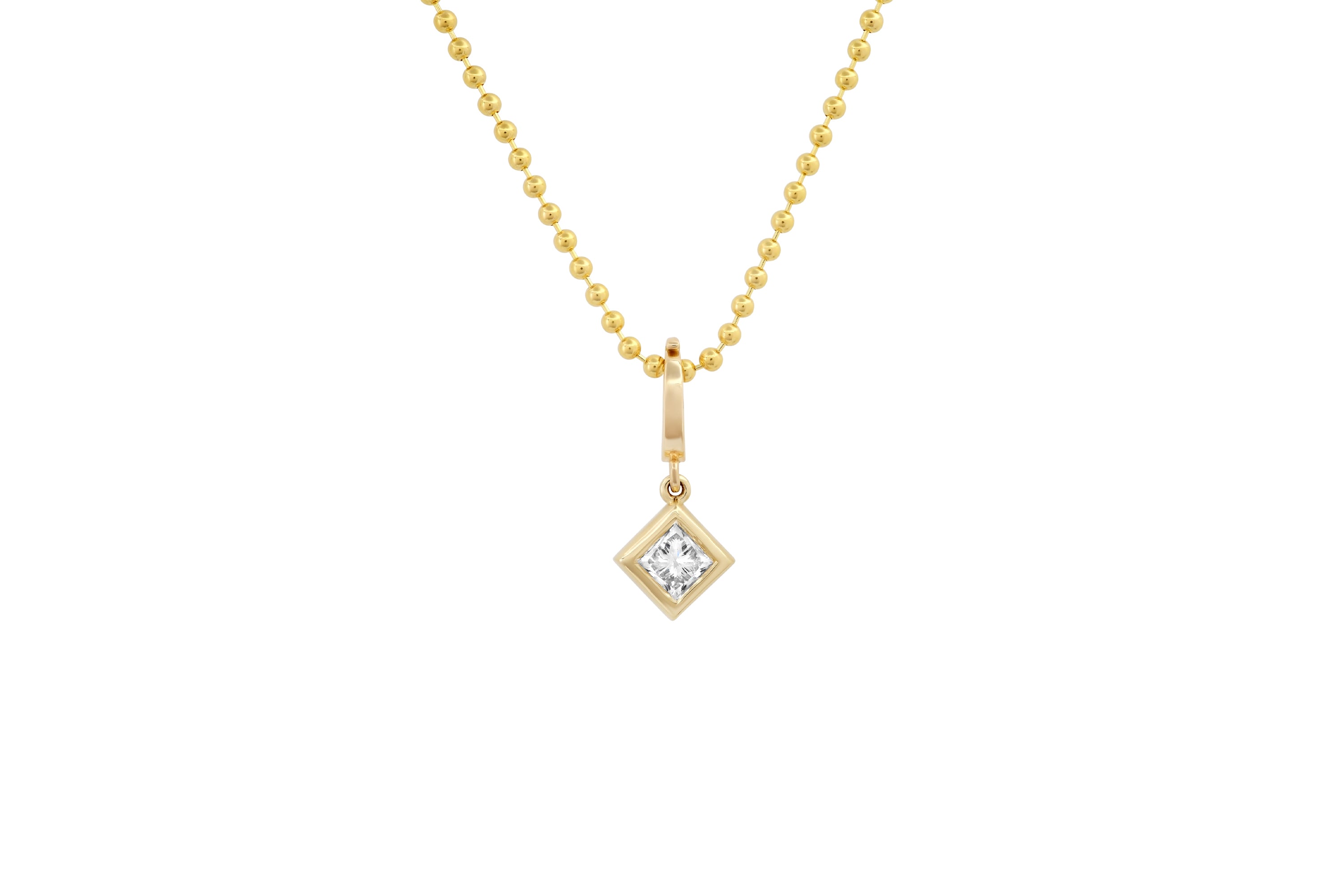 Which shape diamond describes you best? Our Diamond charms help make your necklace layer more personal... Bezel set with a 5mm charm enhancer to be added to any off your favorite chains...Comes with a 2.7mm Ball Chain