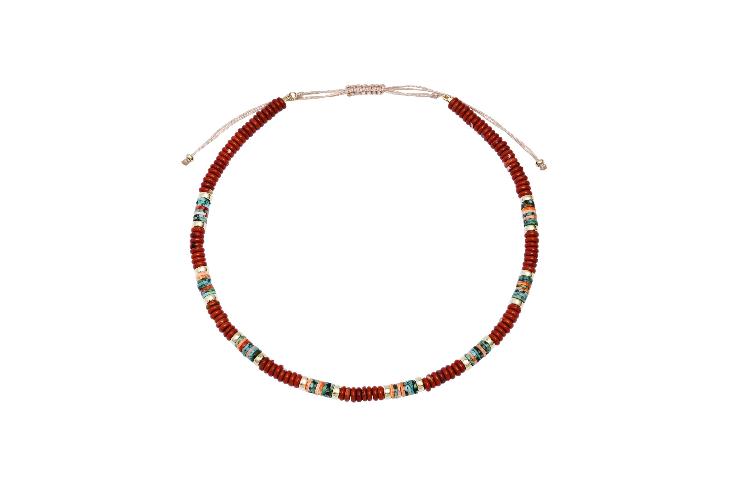 Gorgeous layered necklace featuring vibrant rainbow jasper and spiny oyster turquoise beads accented with 14k gold. The rich, multi-colored palette blends warm earth tones with cool turquoise hues, creating a stunning piece that adds dimension to any look. Perfect for vacation adventures or everyday elegance, this versatile necklace transitions seamlessly from day to night.