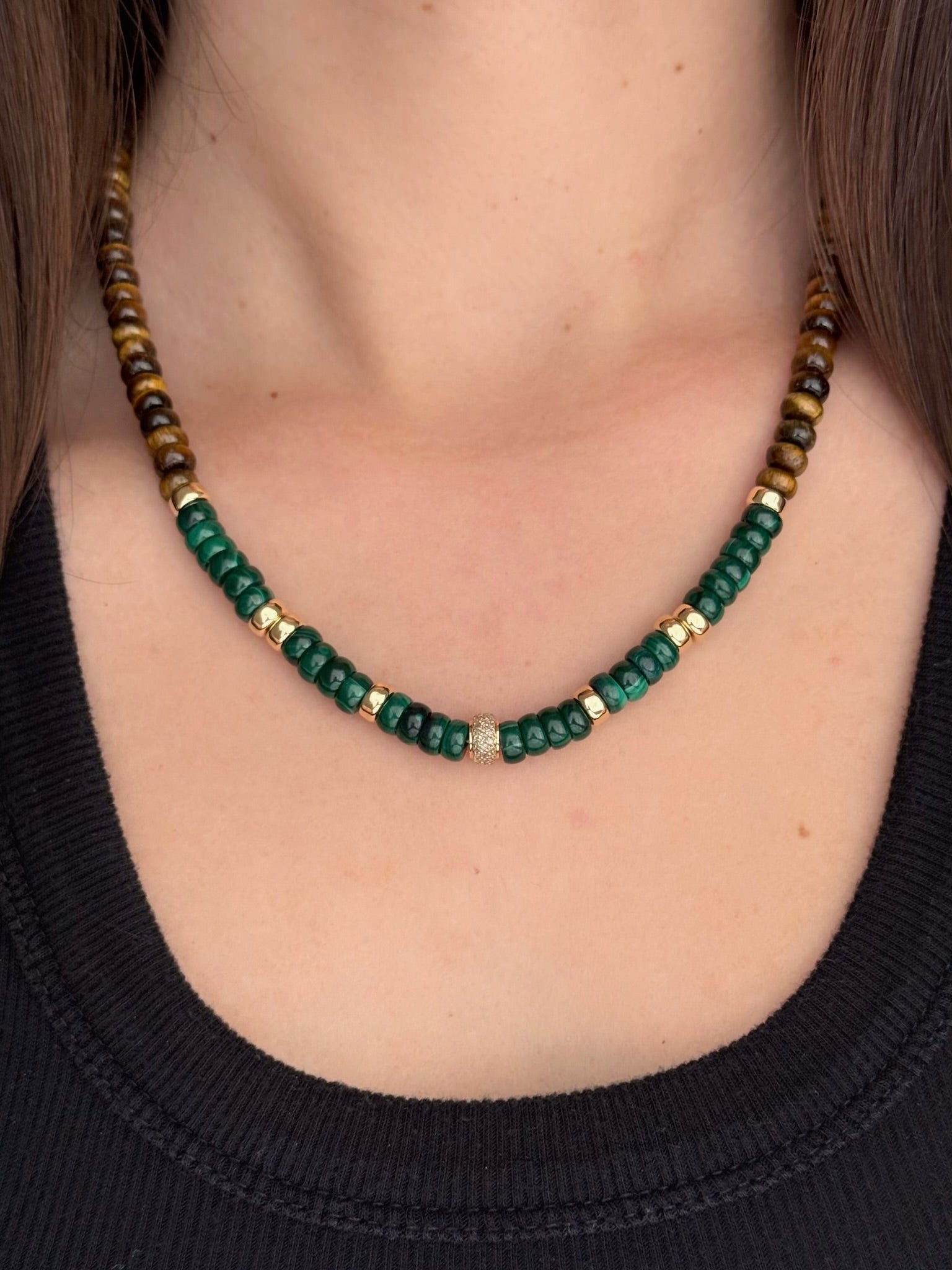 Elevate your fall vibe with this stunning layered necklace featuring rich tiger's eye and malachite beads accented with 14k gold and sparkling diamonds. The warm, earthy tones capture the essence of fall while the precious metals add timeless sophistication. Perfect for stacking or wearing solo, this piece transitions effortlessly from day to evening.