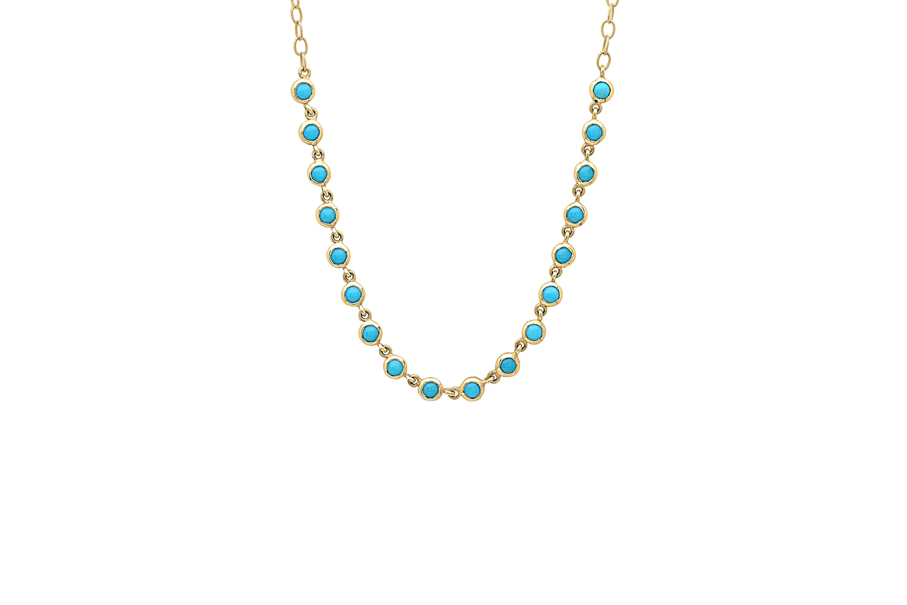 This beautiful 14k gold necklace features an eye-catching design of sleeping beauty turquoise set in a gold bezel. Wear it at different lengths, from choker, to a classic necklace for the perfect look. Suitable for any season!