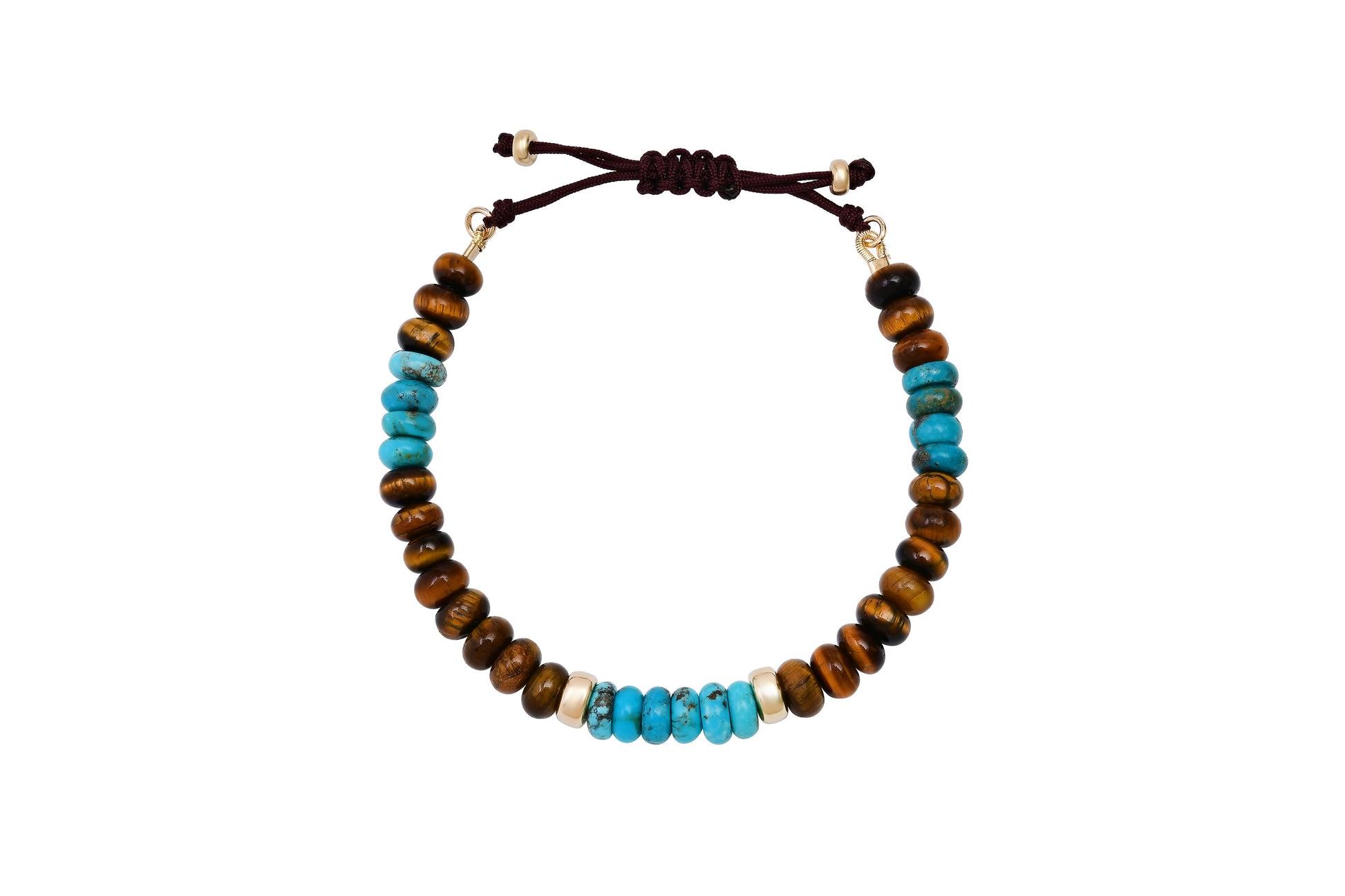 Radiant turquoise and tiger's eye stones meet lustrous 14k gold in this versatile beaded bracelet. Wear it solo for understated elegance or stack multiple pieces for a bold, layered look.