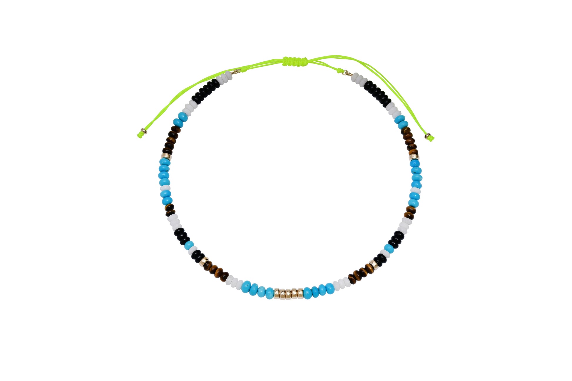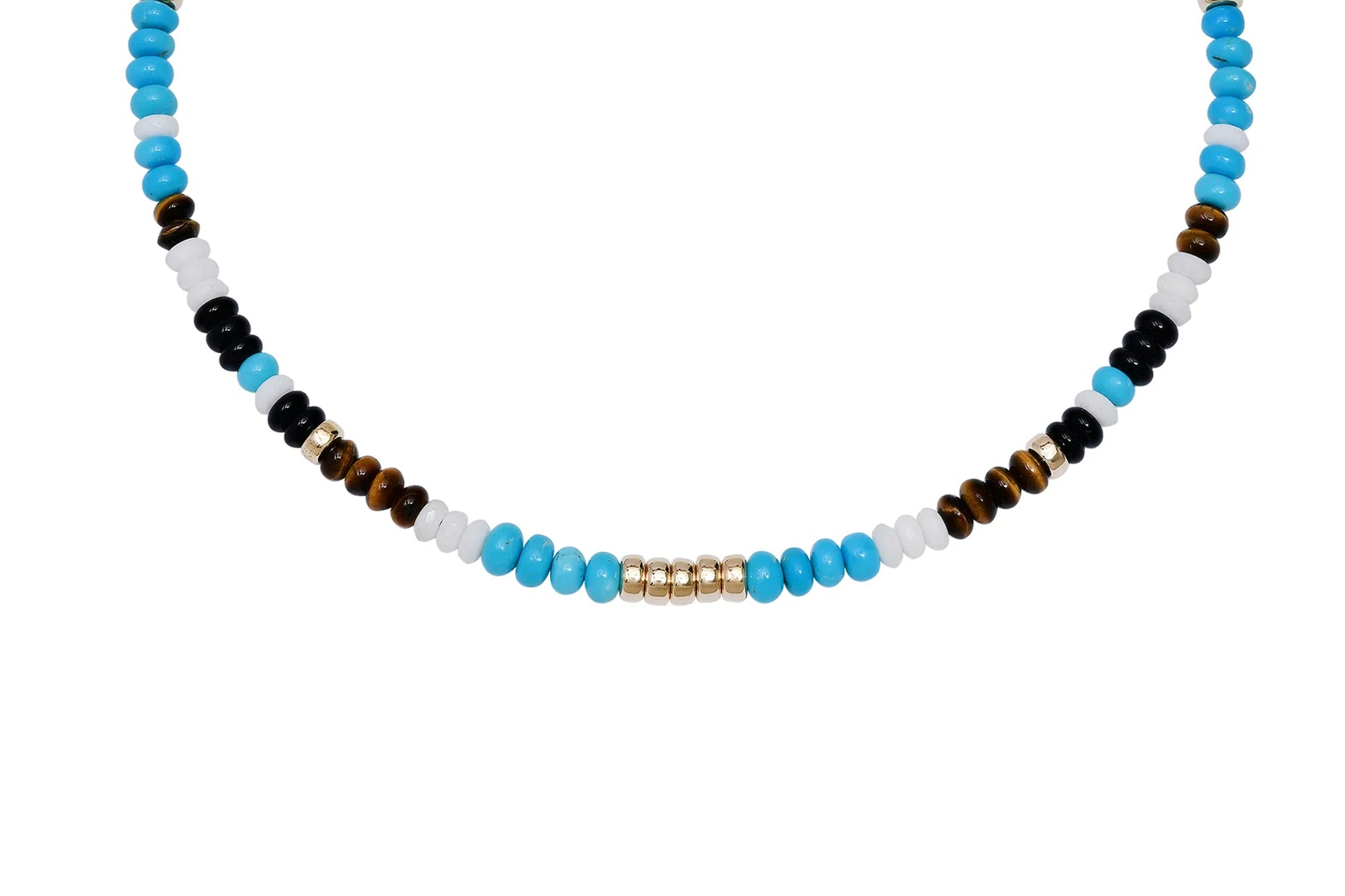 Turquoise, Tiger's Eye, Black and White Onyx, and 14k Gold Beaded Necklace